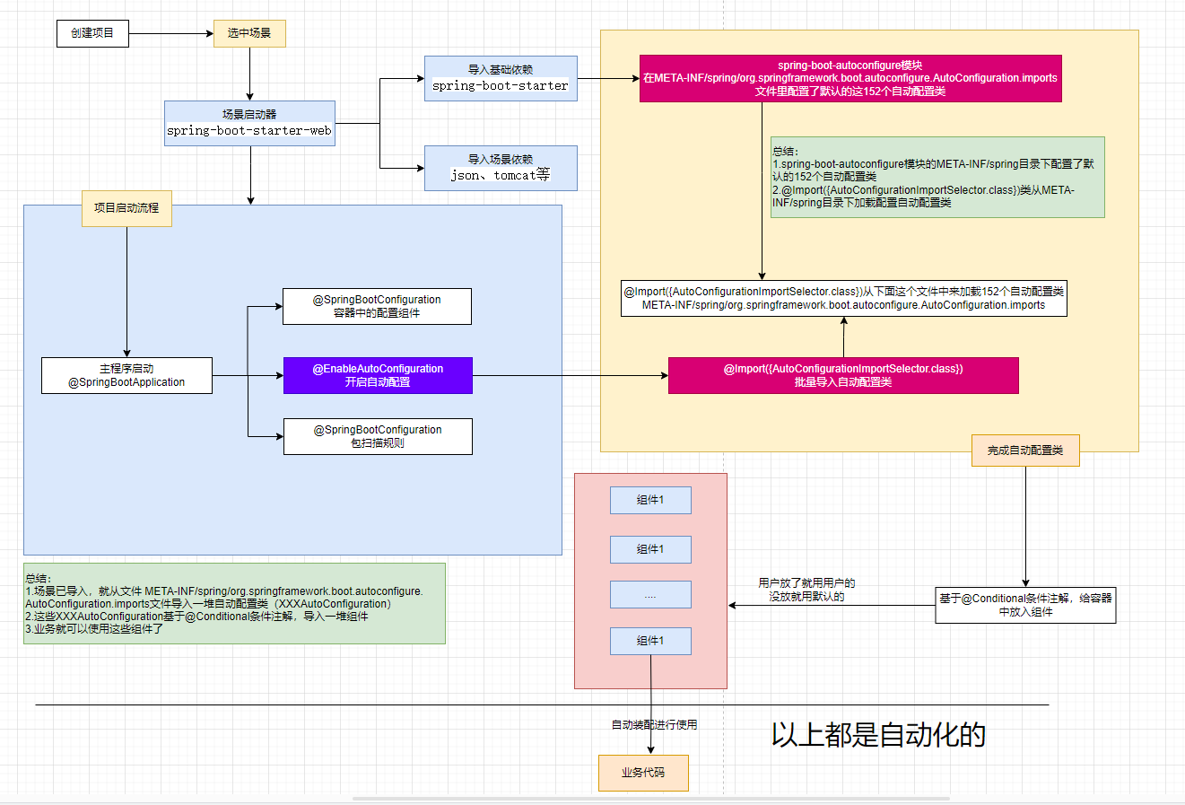 👉 启动时自动帮你装好大部分常用的“零件”(Bean),你只要很少的配置,甚至零配置,就能直接用。