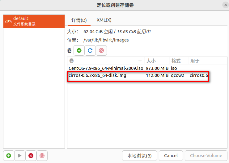 在我的系统中存放了一个 cirros-0.6.2-x86_64-disk.img 镜像文件 。cirros 是一个很小的 linux 镜像,非常适合测试用,大家可以到 http://download.cirros-cloud.net/ 下载,然后放到 /var/lib/libvirt/images/ 目录下,这是 KVM 默认查找镜像文件的地方。