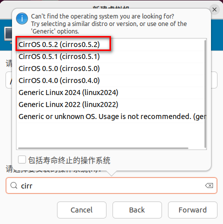 如果是安装新的 IOS,可以选择第一项。如果已经有安装好的镜像文件(Cirros),选第三项(导入磁盘映像)。 接下来需要告诉镜像的位置。