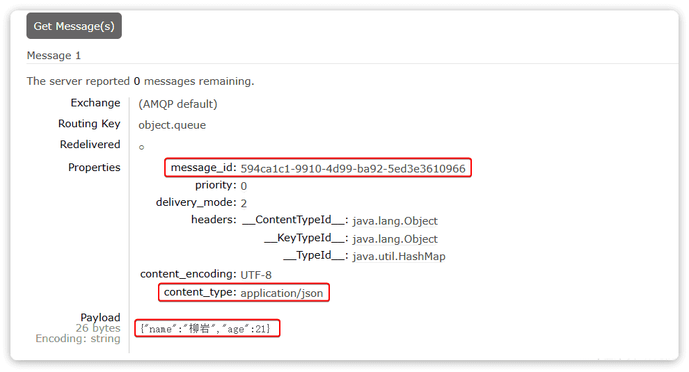 此时,我们到MQ控制台删除object.queue中的旧的消息。然后再次执行刚才的消息发送的代码,到MQ的控制台查看消息结构: